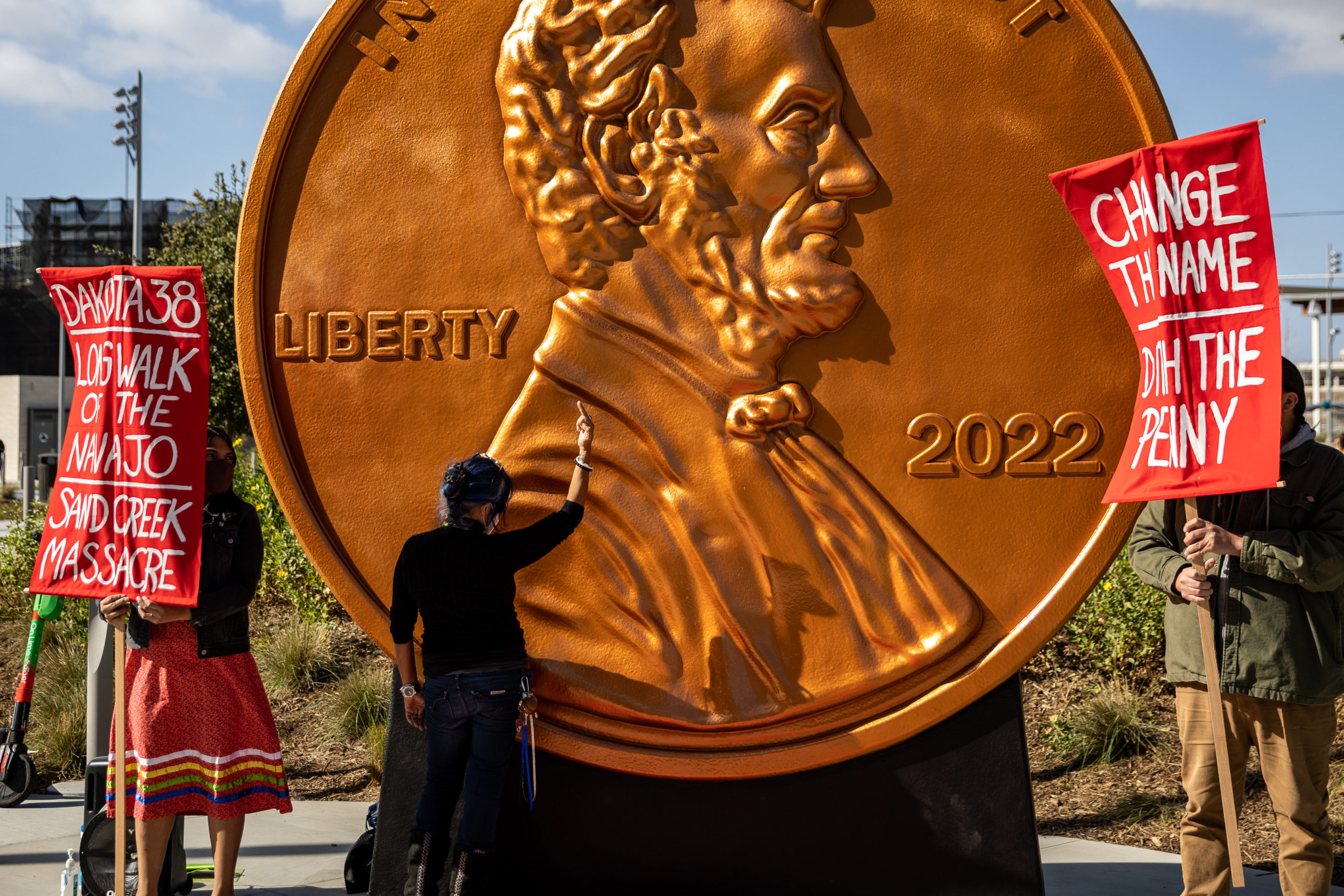 Around two dozen protesters gathered at Lincoln Park in Long Beach on Monday, Feb. 21 to call for the removal of a 13-foot penny statue that was recently erected at the park.