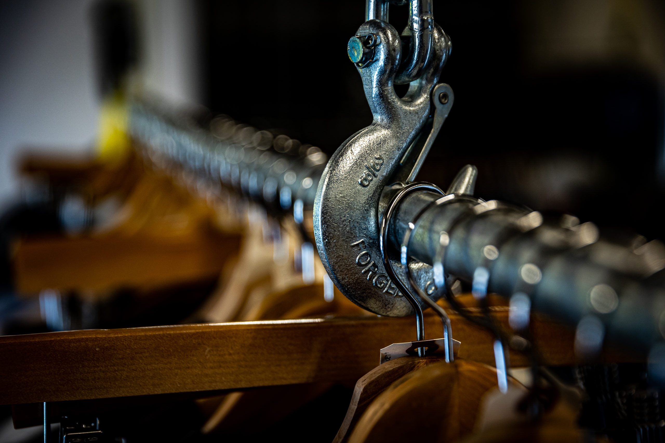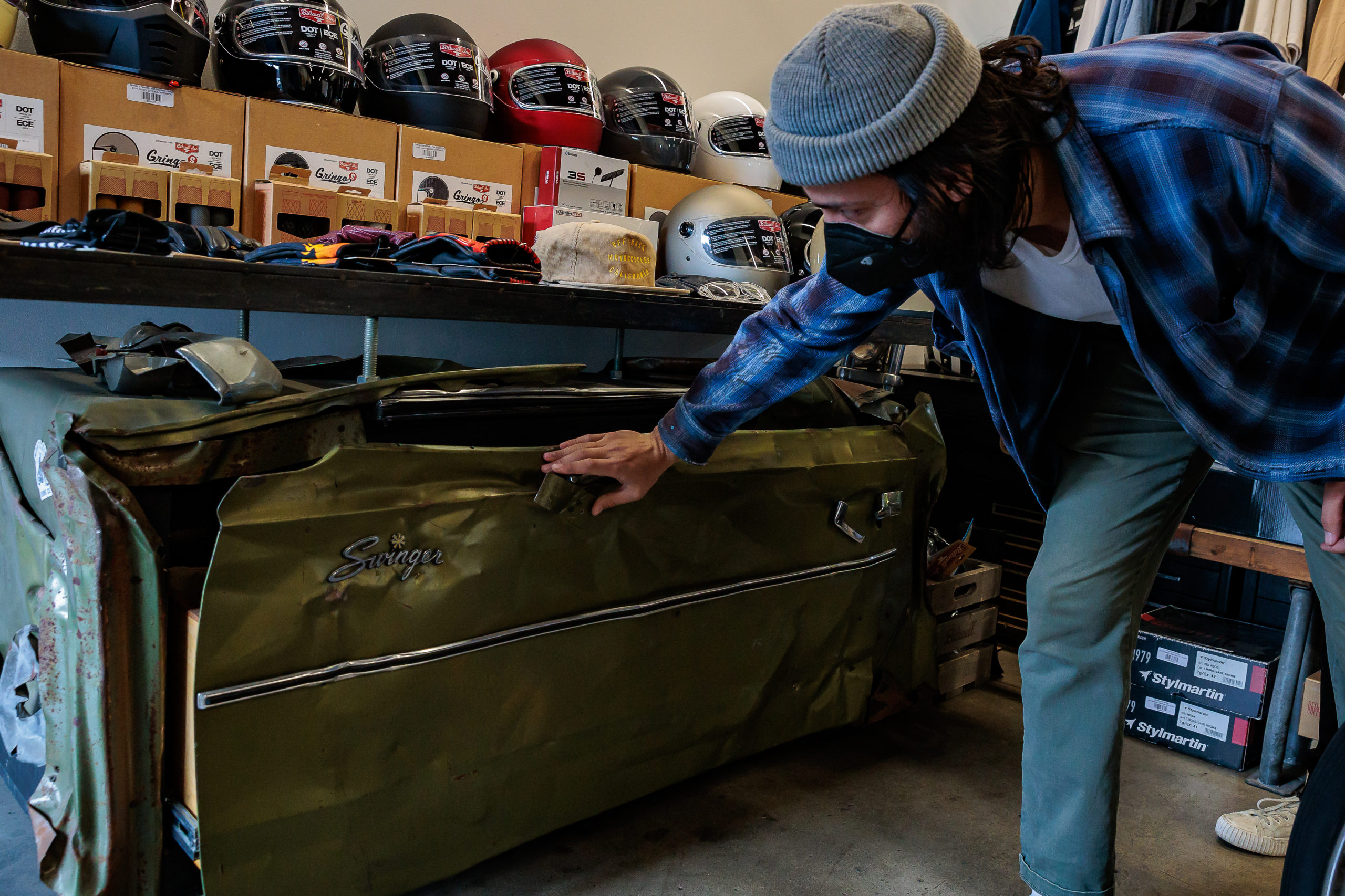 The two worked together to build out the shop’s interior, using ratchet straps to hold up the ends of industrial metal poles, now hung with padded riding gear, leather jackets and apparel.