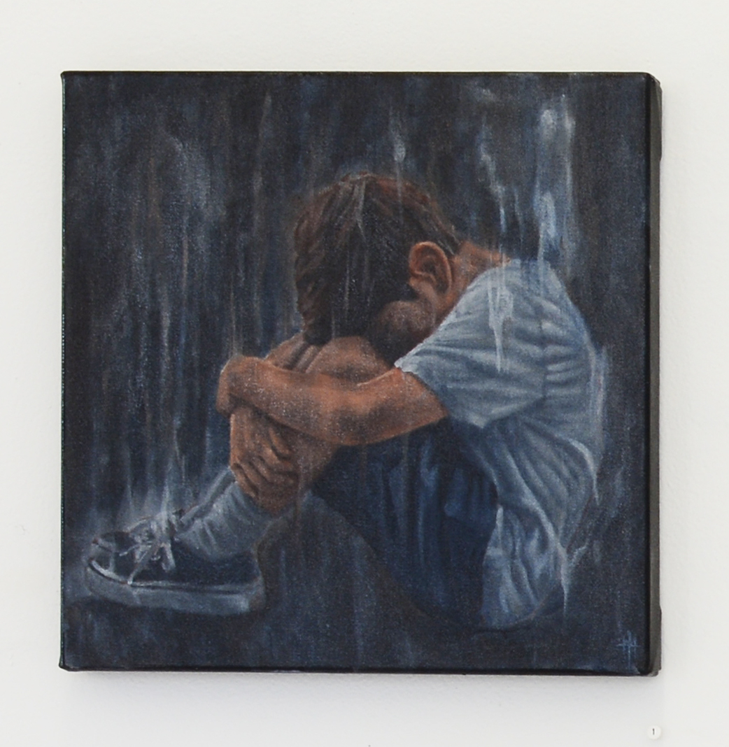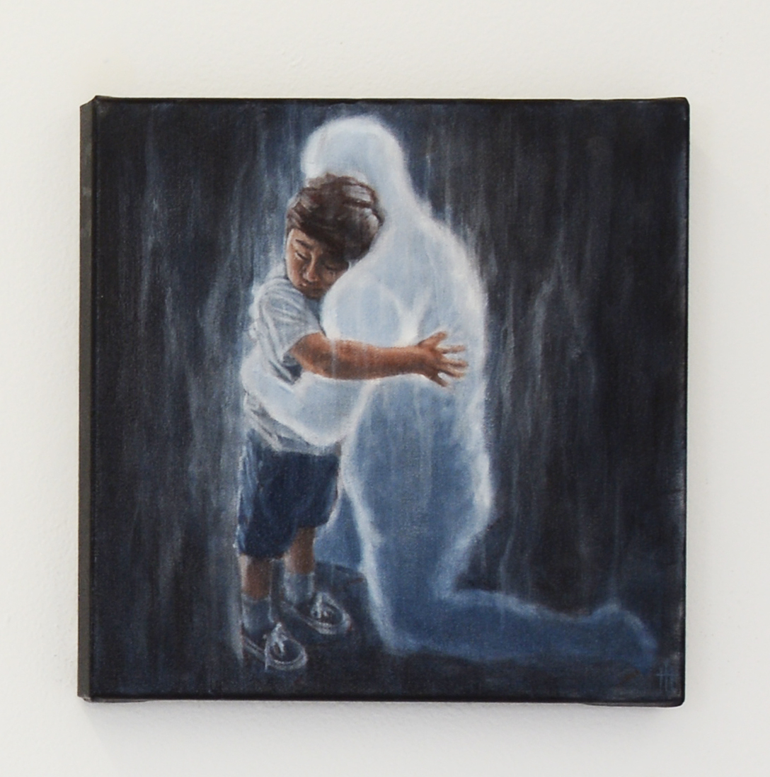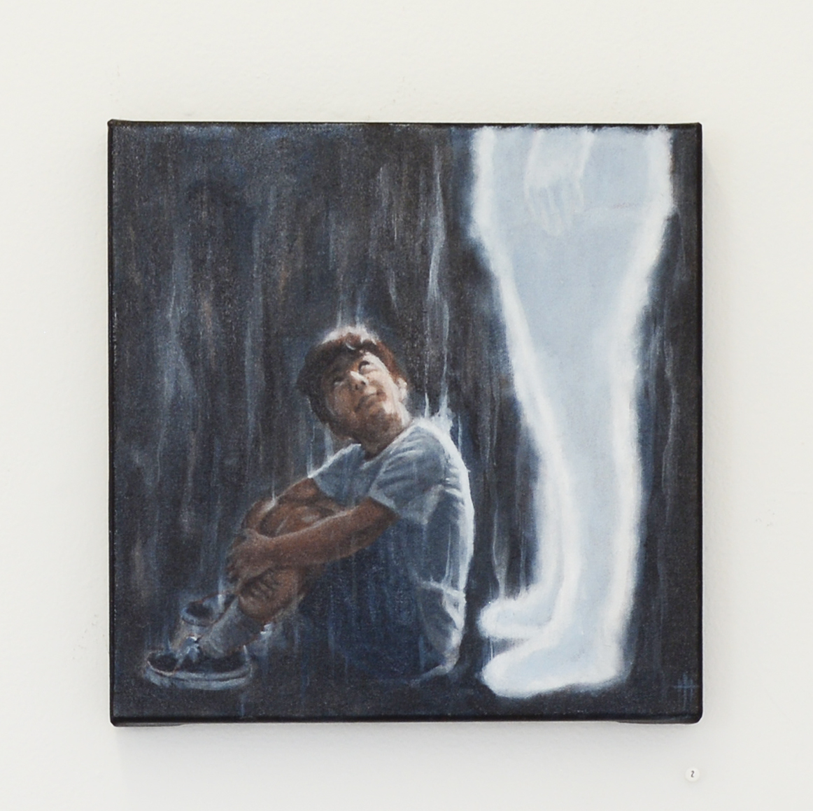 The dream is depicted in three 1-foot by 1-foot paintings. In one, a young boy sits curled up in a ball, surrounded by darkness. In the next, the white silhouette of a pair of legs appears, and the boy turns upwards at an unseen face. In the third, the ghostly-white silhouette lowers itself on a knee to embrace the child.
